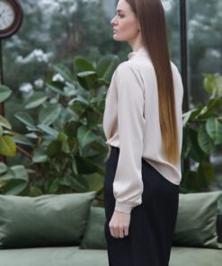 Sunkesnis satino audinys, puikus kritimas, rankogaliai užsegami sagute, gale užsisega užtrauktuku. Klostės priekyje priduoda palaidinei išskirtinio grožio. Palaidinės priekis pailgintas bei šiek tiek užapvalintas. Puikiai tiks prie kelnių, sijono, džinsų.